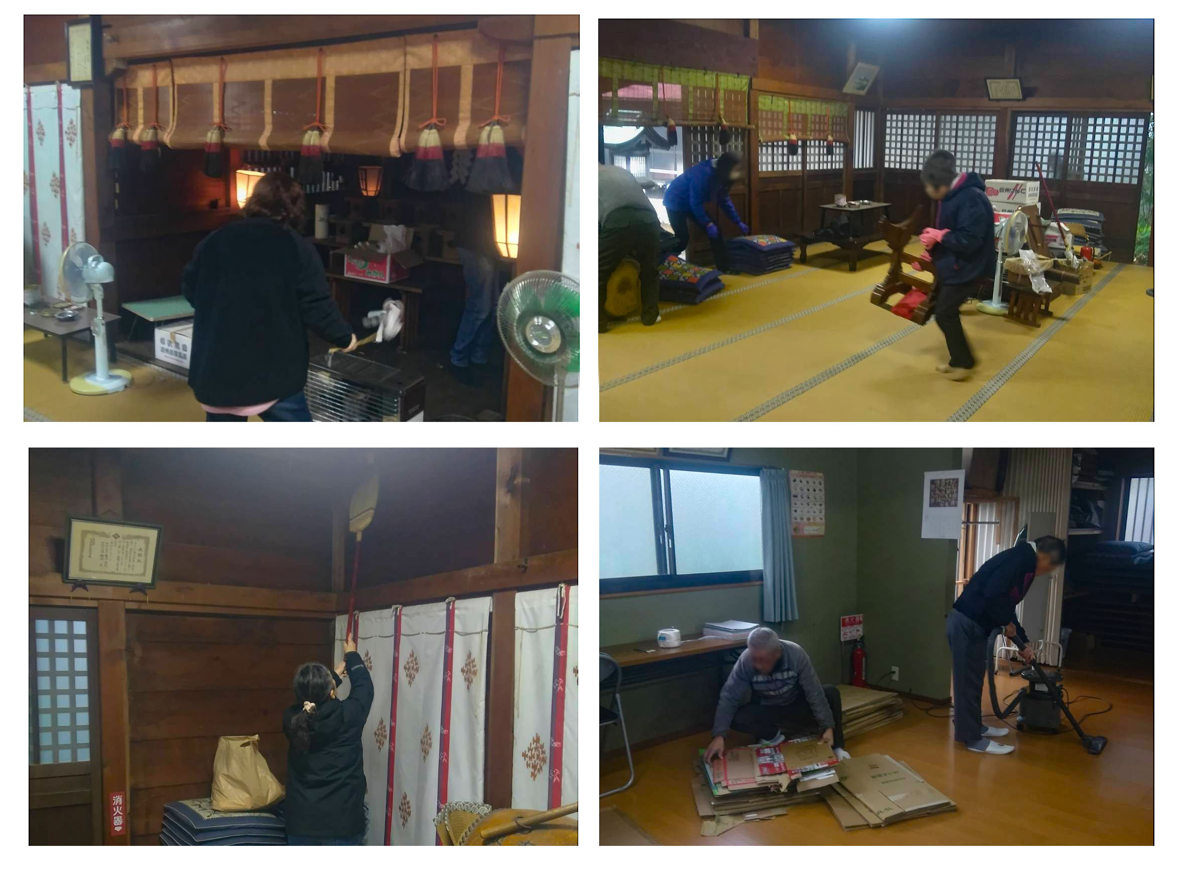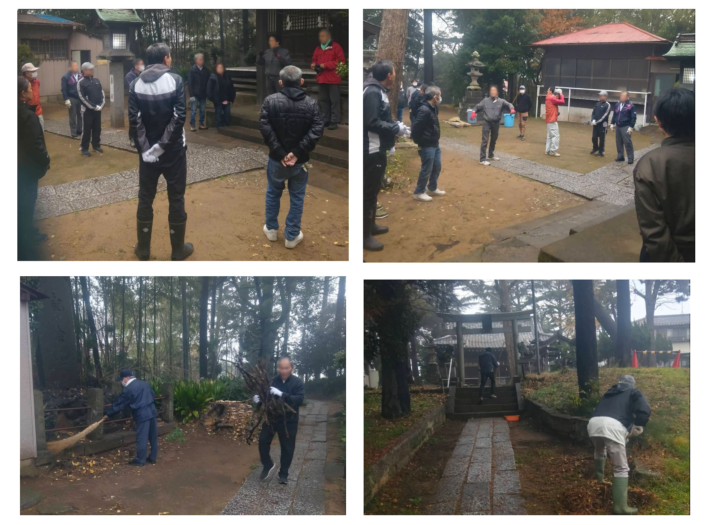 12/20(土)は定期環境整備で翌日の大掃除の前に、神社境内の枝払い・草刈を行いました。翌12/21(日)9時から東船橋自治会会員・近隣自治会の有志18名+役員で茂侶神社境内清掃・本殿清掃・自治会館清掃を行いました。前日からの雨があがった直後の為、落ち葉が湿っている状態でした。そこで境内の落ち葉を参道脇に集めたり、枝を集める程度に留め、茂侶神社本堂・自治会館主体の清掃となりました。参加者の皆様には感謝申し上げます。(会長:武藤眞佐雄)